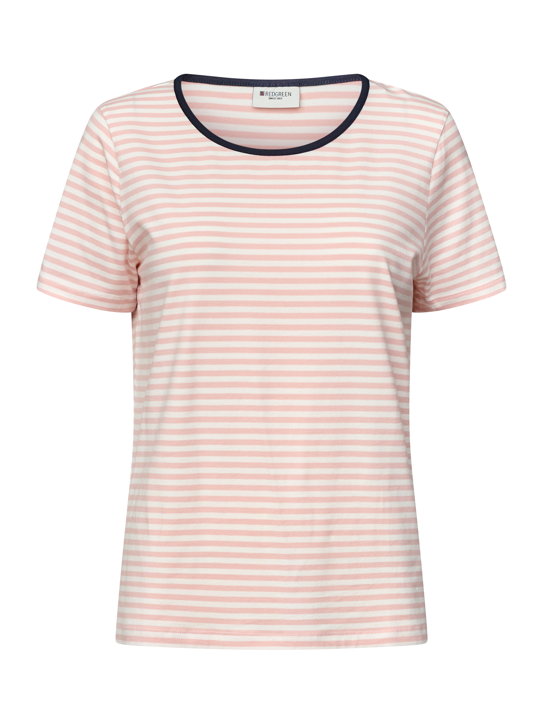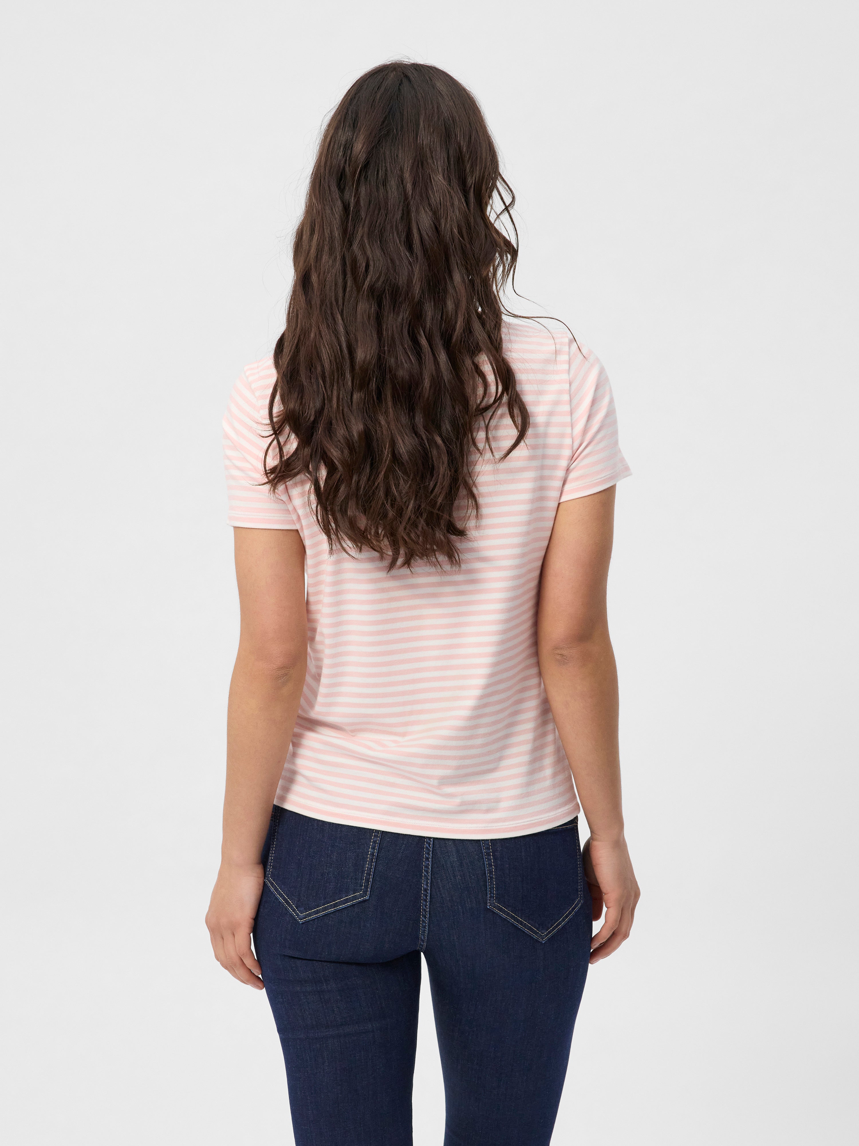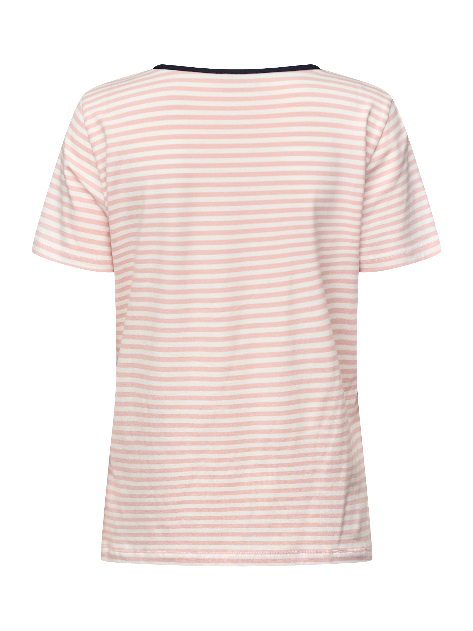 Blød og komfortabel T-shirt i en let og strækbar kvalitet med bomuld og modal. T-shirten har korte ærmer, rund halsudskæring og et diskret, stribet design, der giver et enkelt og afslappet udtryk – ideel til hverdagsbrug.