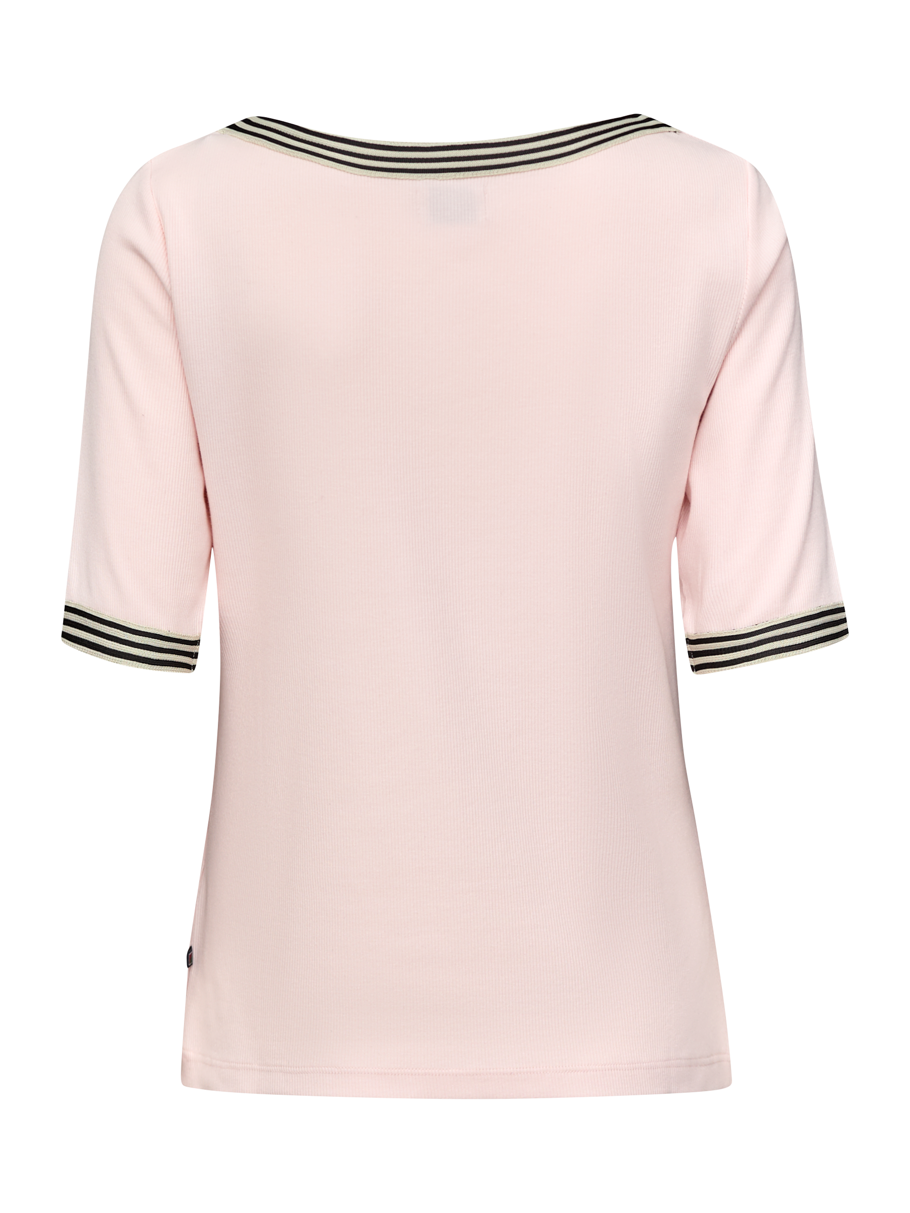 Elegant og komfortabel T-shirt med fine kontrastdetaljer, fremstillet i en blød og strækbar kvalitet. En alsidig T-shirt, der fungerer både til hverdag og mere pæne anledninger.