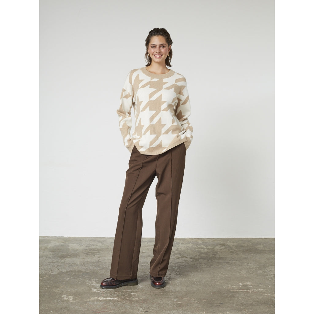 • En klassisk strik i en moderne udgave. Denne trøje er designet med et markant hundetandsmønster i beige og hvid, som giver et grafisk og stilrent udtryk. Med rund hals, lange ærmer og en behagelig pasform er den både komfortabel og nem at style til hverdag.