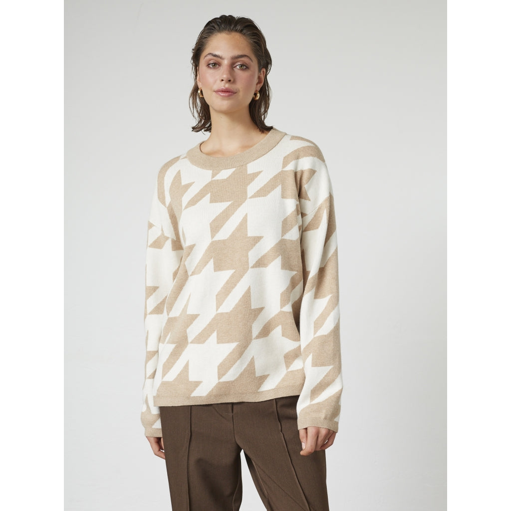 En klassisk strik i en moderne udgave. Denne trøje er designet med et markant hundetandsmønster i beige og hvid, som giver et grafisk og stilrent udtryk. Med rund hals, lange ærmer og en behagelig pasform er den både komfortabel og nem at style til hverdag.