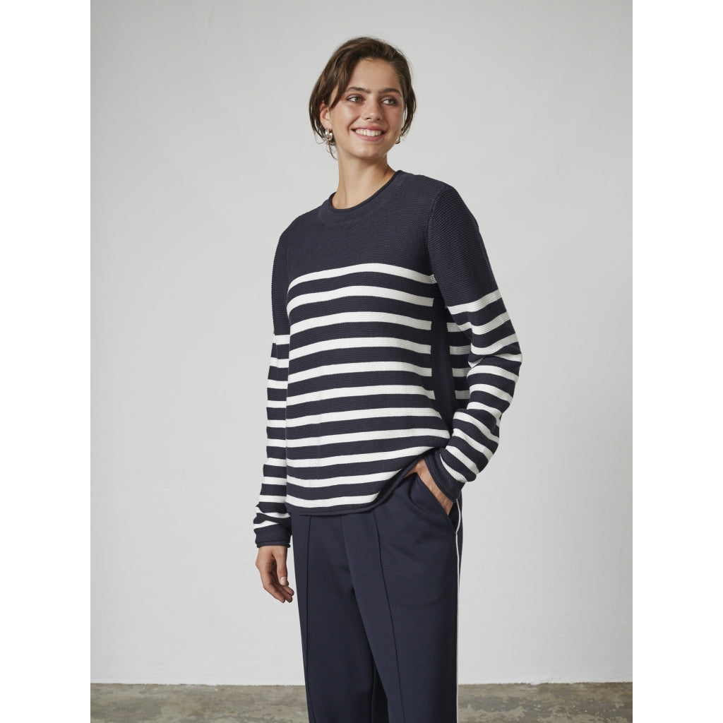 Stribet trøje i en blød og behagelig strikkvalitet. Det klassiske mønster kombineret med en afslappet pasform gør den ideel til hverdagsbrug – både alene og som lag under en jakke.