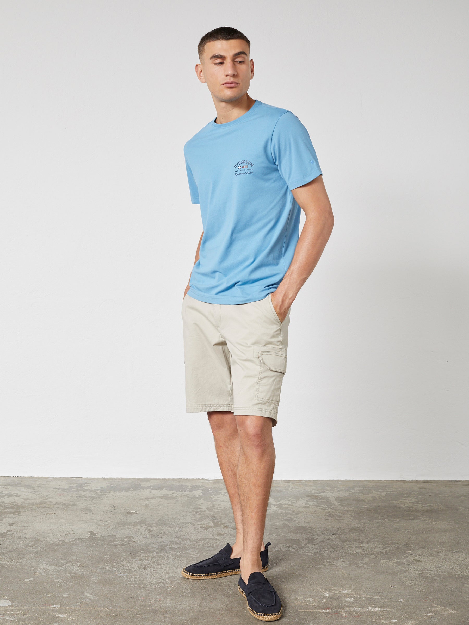Afslappet herre-T-shirt i blød bomuldsblanding med stræk og et diskret brystprint. Den behagelige kvalitet og fleksible pasform gør T-shirten velegnet til hverdagsbrug og afslappede fritidslooks.