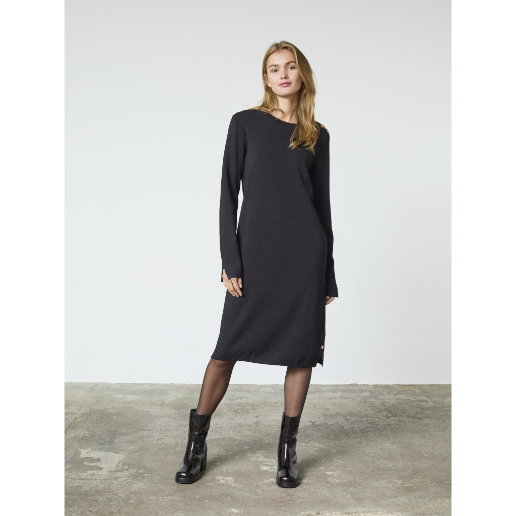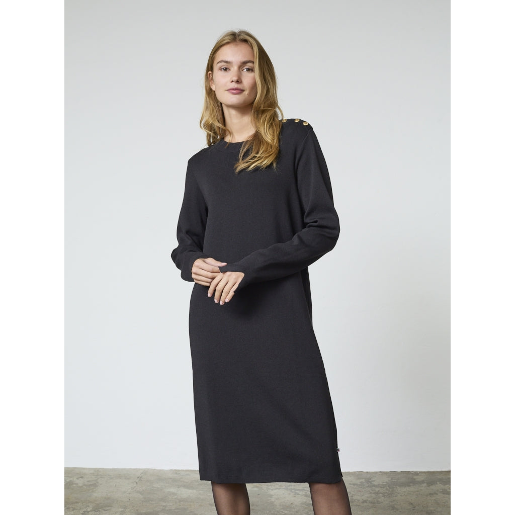 Enkel elegance møder komfort i denne kjole med lange ærmer og et lige snit. De fine knapdetaljer ved skulderen giver et diskret maritimt præg, mens den bløde kvalitet gør kjolen behagelig at bære hele dagen. En stilren garderobeklassiker, der kan bruges både med strømpebukser til hverdagen og med støvler til en mere raffineret stil.