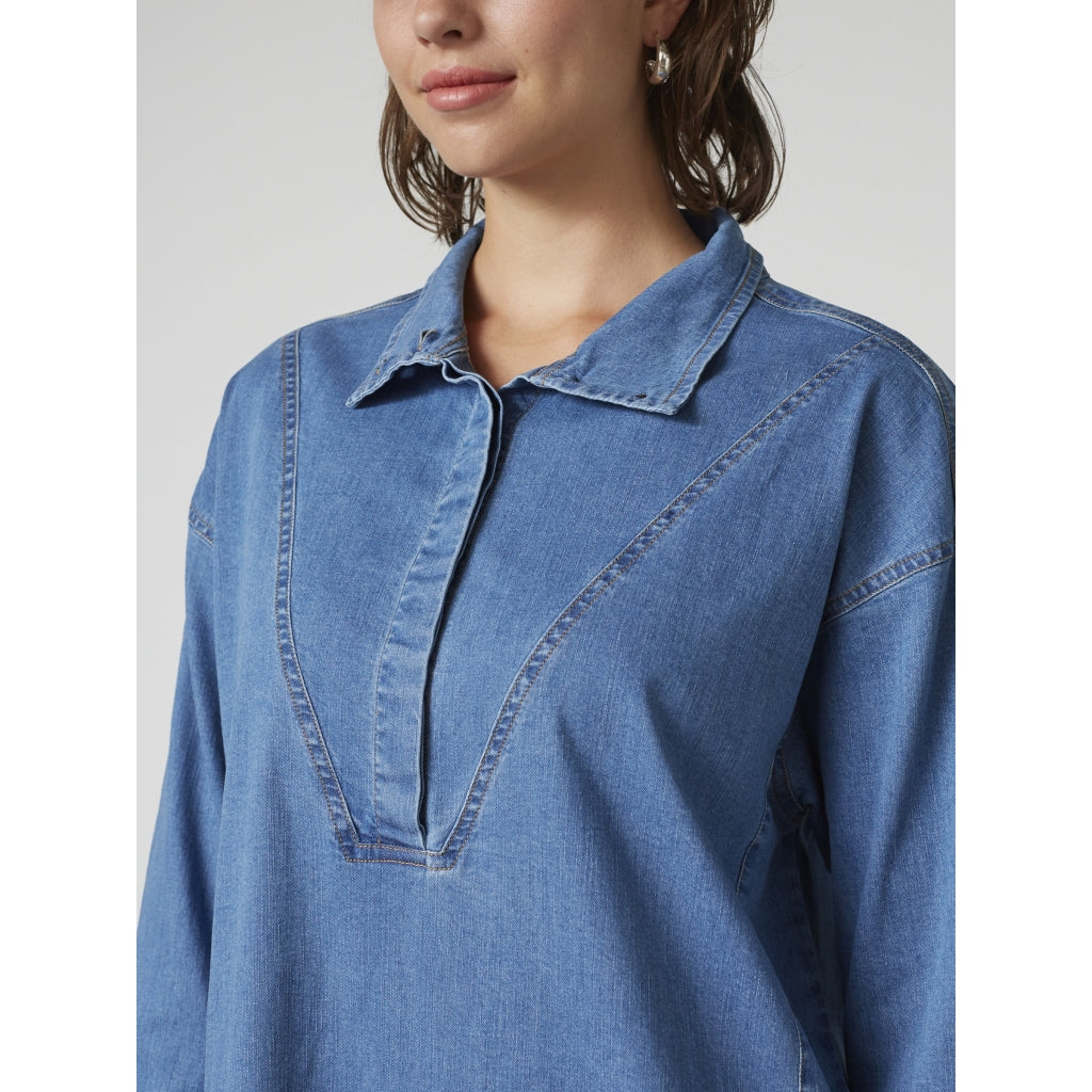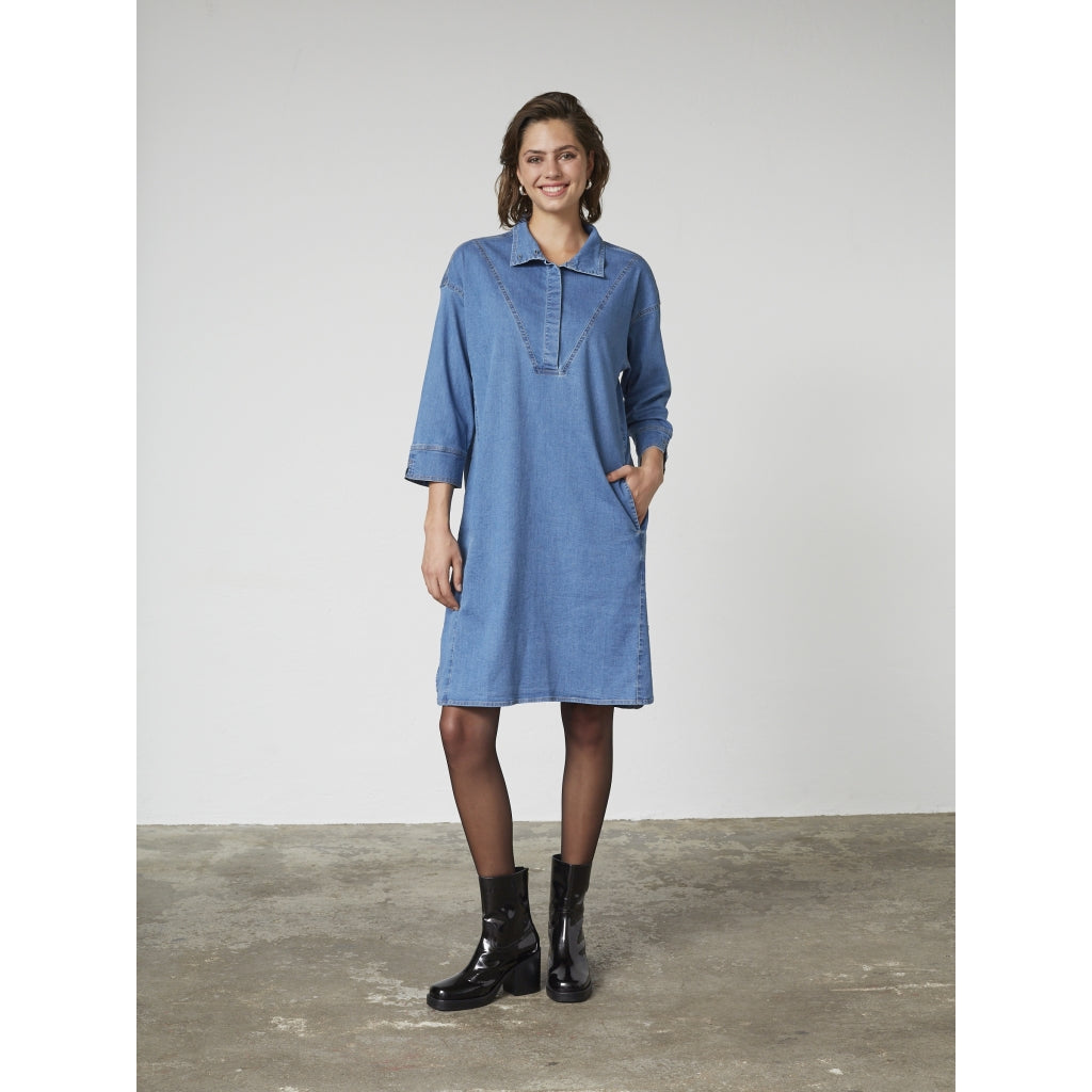 Afslappet skjortekjole i denim-look med trekvartærmer og stolpelukning. Let kvalitet og rummelig pasform gør den ideel til både hverdagsbrug og afslappede dage.