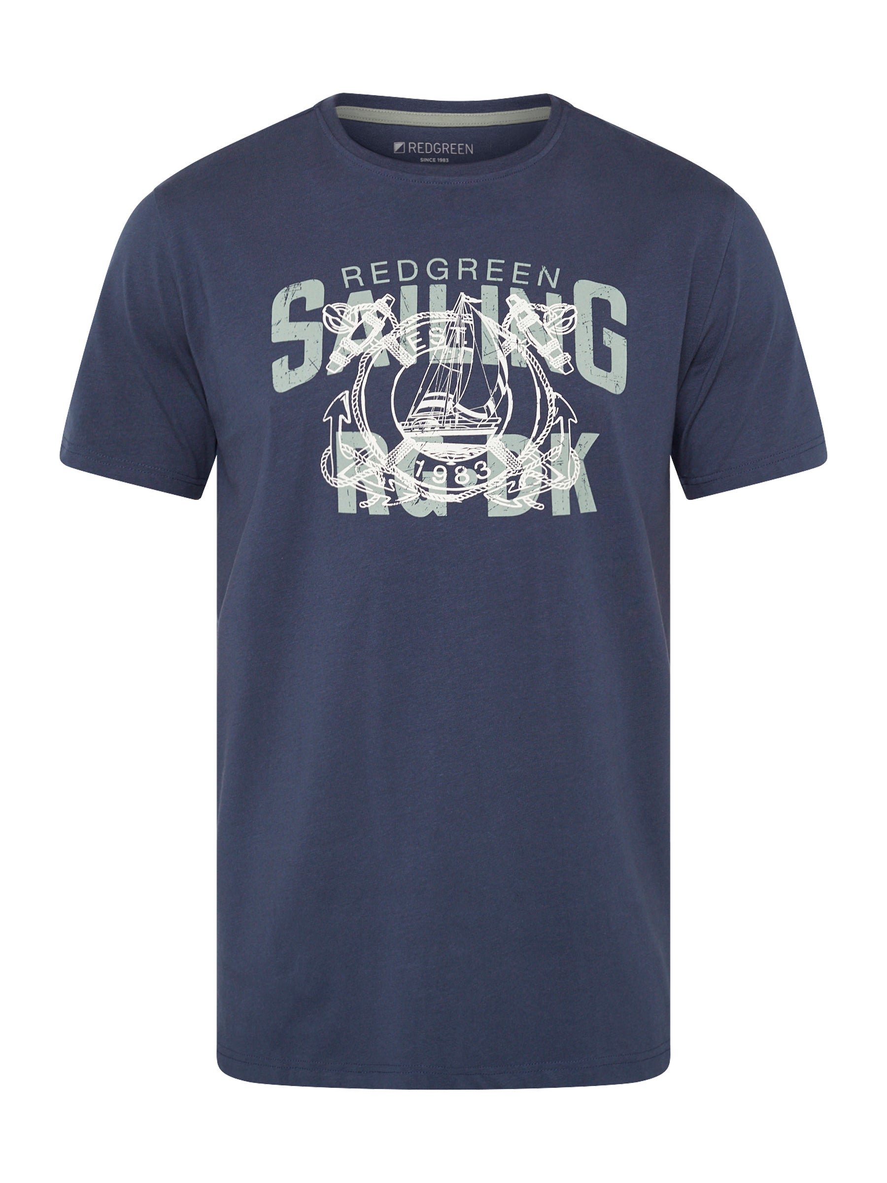 Afslappet herre-T-shirt i blød bomuldsblanding med stræk og et markant grafisk brystprint. Den behagelige kvalitet og fleksible pasform gør T-shirten velegnet til hverdagsbrug og afslappede fritidslooks.