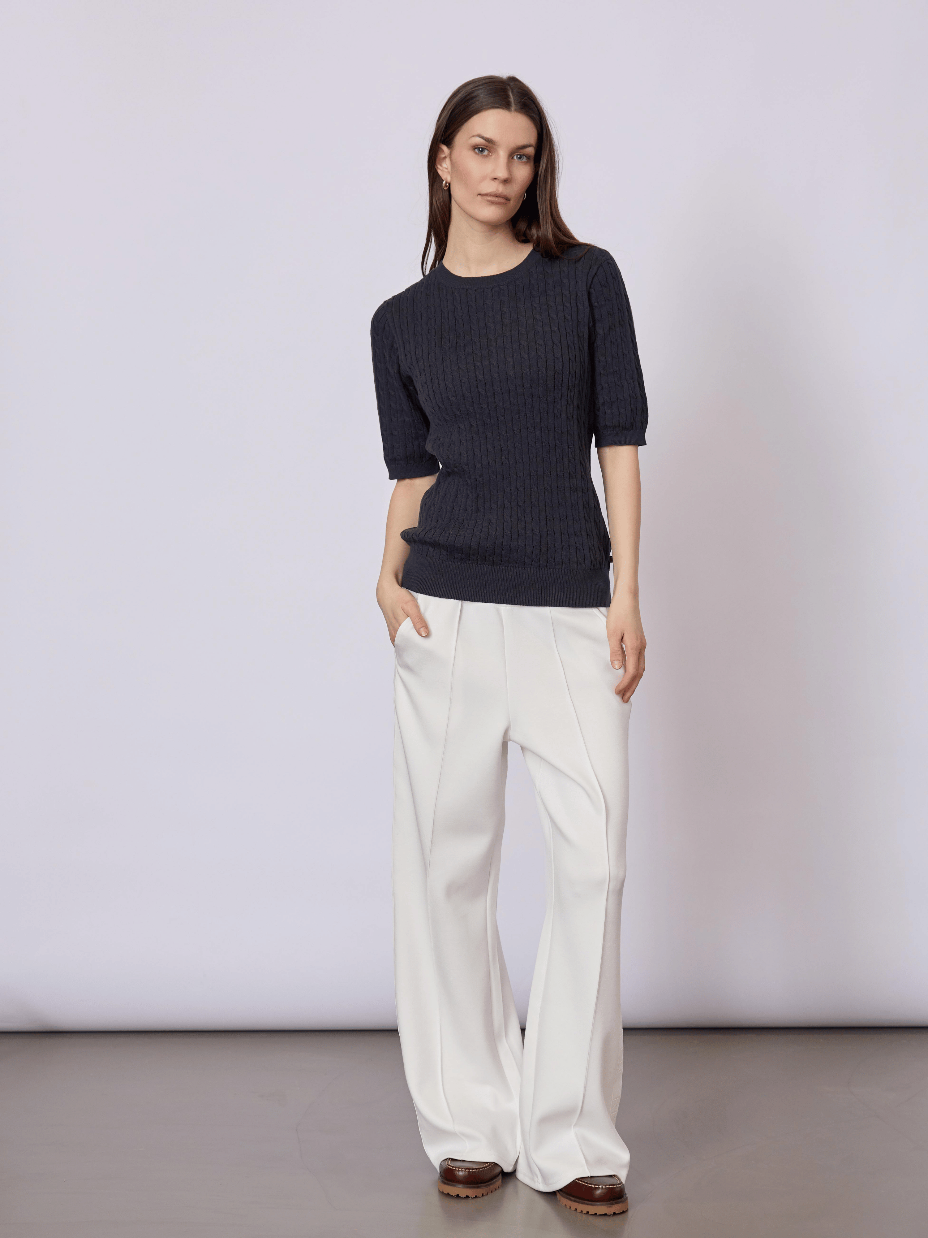 Let og feminin strikbluse i 100% økologisk bomuld med et fint, struktureret mønster og et klassisk udtryk. Blusen har korte ærmer, polokrave og knaplukning foran, som giver et elegant og tidløst look.